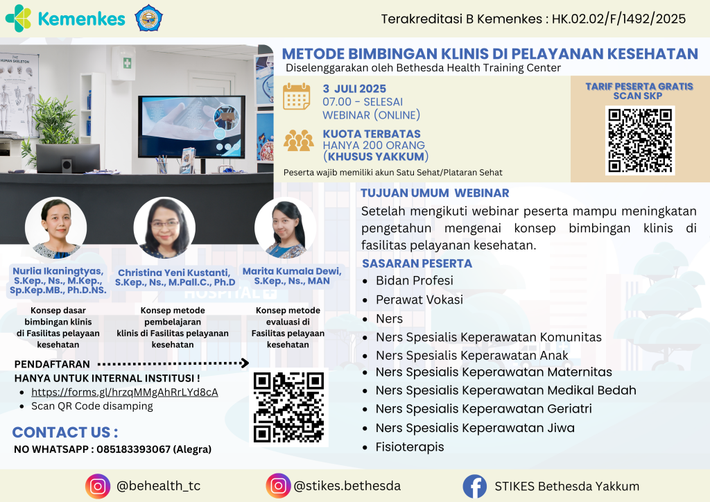 Pada Kamis, 3 Juli 2025, Bethesda Health Training Center telah sukses melaksanakan Webinar Bimbingan Klinis perdana secara online! πSesi ini menjadi momen bersejarah karena merupakan kali pertama kami menyelenggarakan webinar dengan topik ini, dan luar biasanya lagi, dibawakan oleh para pembicara hebat dan inspiratif! πTerima kasih untuk partisipasi dan antusiasme semua peserta! Sampai jumpa di webinar selanjutnya! π»β¨
