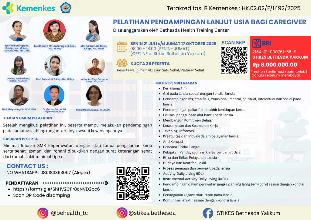 Bethesda Health Training Center membuka pelatihan Caregiver mulai 21 Juli hingga 17 Oktober 2025.